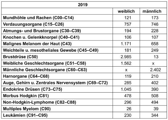 Tabelle 2: Verteilung der Tumorarten auf die verschiedenen Entitäten und Geschlechter. Datenbankabfrage beim Zentrum für Krebsregisterdaten (ZfKD) [3].