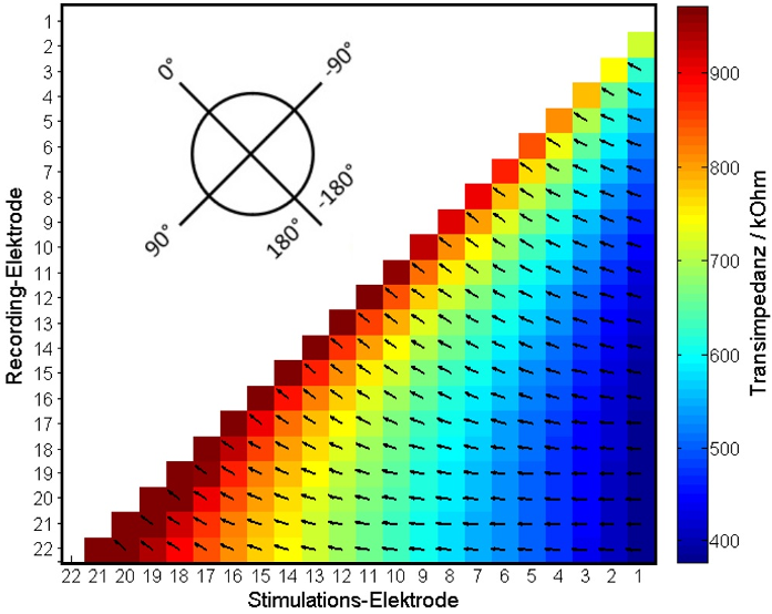 Die TIM-Daten wurden unmittelbar nach vollständiger Insertion mit der Software CustomSound EP (Version 6.0, Cochlear Ltd.) aufgezeichnet. Es wurde eine vollständige 22x22 Transimpedanzmatrix erhoben, indem nacheinander jede der 22 Elektroden als Stimulator diente und die jeweils übrigen als Empfänger. Die Messungen erfolgten mit der maximal möglichen Stromstärke (196–223 CL, die von Custom Sound EP automatisch aus der Compliance-Grenze berechnet wird und patientenabhängig variiert. Die Impulsparameter umfassten eine Pulsbreite von 25 µs und einen Inter-Phase-Gap von 9 µs.