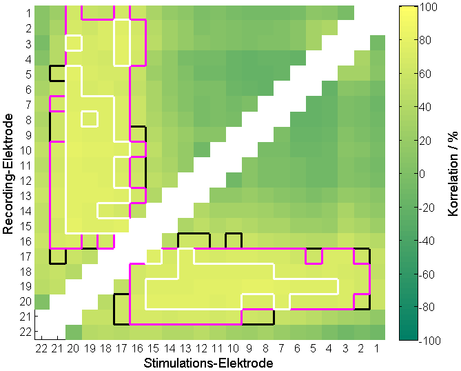 Es zeigte sich eine signifikante Korrelation zwischen den Gradientenphasen der TIM und der Insertionstiefe (Abbildung 2 [Abb. 2]). Insgesamt wiesen 154 Elektrodenpaare signifikante, 136 stark signifikante und 61 hochsignifikante Zusammenhänge mit der maxAID auf. Die signifikante Korrelation betraf Elektroden, die apikal im Bereich von E17 bis E21 lagen, während die jeweils zugehörigen Partner-Elektroden variabler positioniert waren, typischerweise zwischen E2 und E17.
