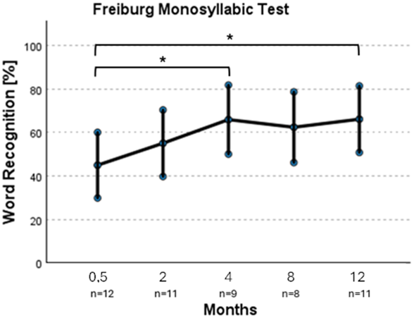 Figure 2: Word recognition performance over the months in the Freiburg monosyllabic test
