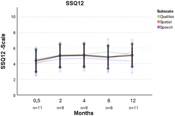 Figure 3: Results of the “Speech Spatial Qualities Questionnaire” (SSQ12) over the months