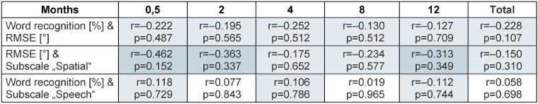 Compared to data collected two weeks after initial fitting, a significant reduction in root mean square error (RMSE) for localization was observed after eight months (t(36)=–3.114, p=0.033) and twelve months (t(35)=–3.432, p=0.016) (Figure 1 [Fig. 1]). Monosyllabic speech recognition significantly improved after four months (t(36)=3.334, p=0.018) and twelve months (t(36)=3.596, p=0.010) (Figure 2 [Fig. 2]). However, total SSQ12 scores did not show significant changes after twelve months (t(32)=2.143, p=0.398), nor did the subscales “Speech” (t(32)=0.684, p=1.000) and “Qualities” (t(32)=1.057, p=1.000). The “Spatial” subscale showed a value near statistical significance (t(32)=2.974, p=0.055) (Figure 3 [Fig. 3]). No significant correlation has been found thus far between localization performance, speech recognition, and subjective hearing perception (Table 1 [Tab. 1]).
