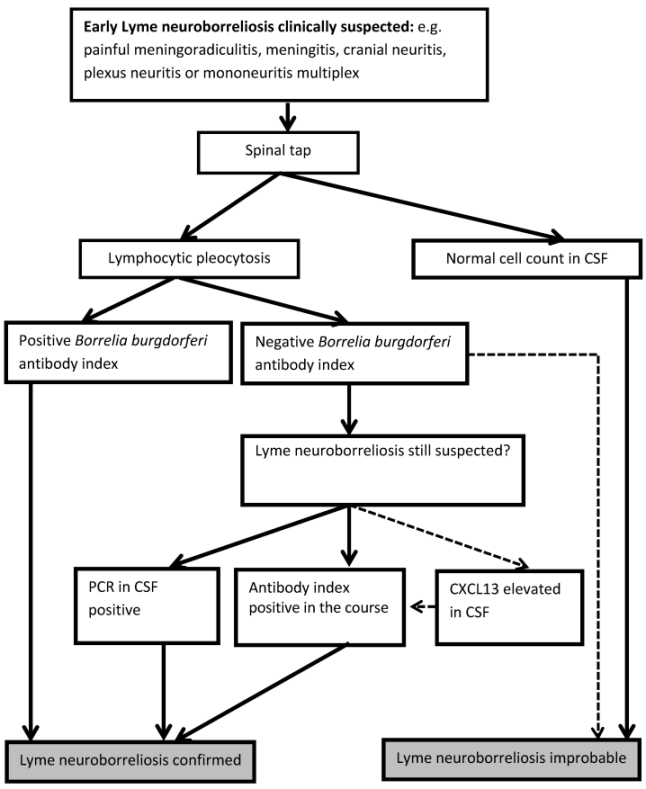 [156] Coumou J, Herkes EA, Brouwer MC, van de Beek D, Tas SW, Casteelen G, van Vugt M, Starink MV, de Vries HJ, de Wever B, Spanjaard L, Hovius JW. Ticking the right boxes: classification of patients suspected of Lyme borreliosis at an academic referral center in the Netherlands. Clin Microbiol Infect. 2015 Apr;21(4):368.e11-20. DOI: 10.1016/j.cmi.2014.11.014