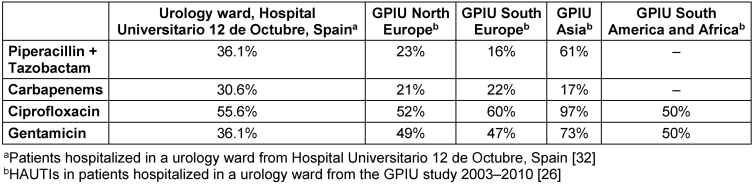 The isolation of extended-spectrum beta-lactamase (ESBL) producing bacteria is a significant concern, as the selection of adequate antibiotic treatment is a challenging task. In patients with HAUTIs hospitalized in a urology ward, a percentage of 27.8% ESBL-producing bacteria has been described [32], [45]. These data are in agreement with other general series, which report percentages between 15% and 44% in hospitalized patients [46]. The higher risk of isolation of multidrug-resistant pathogens in urological patients is related, among others, to a higher prevalence of urinary catheter carriers during hospitalization. Figure 4 [Fig. 4] and Figure 5 [Fig. 5] summarize the results regarding resistance in patients with HAUTIs from the GPIU study [20], [26], [28], [29].