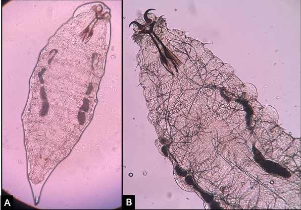 Figure 2: Microscopic morphology of Oestrus ovis showing (A) spindle-shaped larva with an eleven-segmented body and a pair of curved hooks in the anterior region. (B) Higher magnification focusing on the anterior end of larva depicting characteristic sharp, powerful dark brown oral hooks connected to the cephalopharyngeal skeleton.