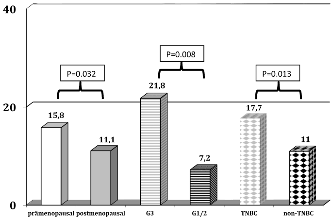 So zeigte sich insbesondere in der Subgruppe der sog. „triple negativen“ Mammakarzinome ein signifikant häufigeres Vorkommen eines posttherapeutisches Lymphödems gegenüber Patientinnen mit nicht-triple negativem Tumor (28 Fälle/17,7% vs. 96 Fälle/11,0%; P=0.013). Ebenso ließ sich bei Patientinnen mit entdifferenziertem Tumorgewebe signifikant häufiger ein Armlymphödems dokumentieren (Grading G3 vs. G1/2; P=0.0008). Näheres s.a. Abbildung 1 [Abb. 1].