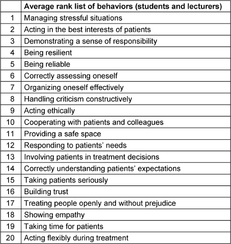 Results: Dental lecturers and students consider emotional resilience, particularly stress management, to be especially important during dental studies, while patient-related behaviors are of lesser priority – possibly due to the constraints of the academic environment. In contrast, patients and dentists emphasize the importance of helpfulness and caring conduct during treatment.