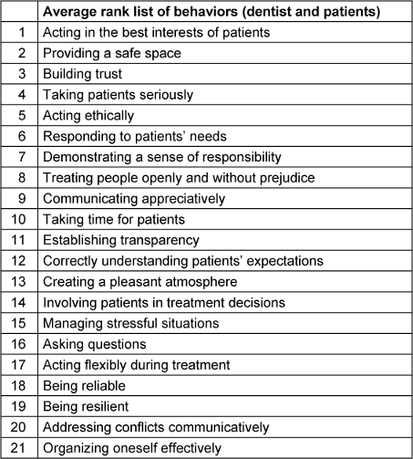 Conversely, four of the top five behaviors mentioned by patients and dentists concerning practice focus on patient interaction, including “acting in the interest of patients”, “providing a safe space”, and “taking patients seriously”. Overall, both patients and dentists assign particular importance to social engagement skills [36] such as “building trust”, “responding to patients’ needs”, and “communicating respectfully” (all within the top 10) as essential for dental practice.