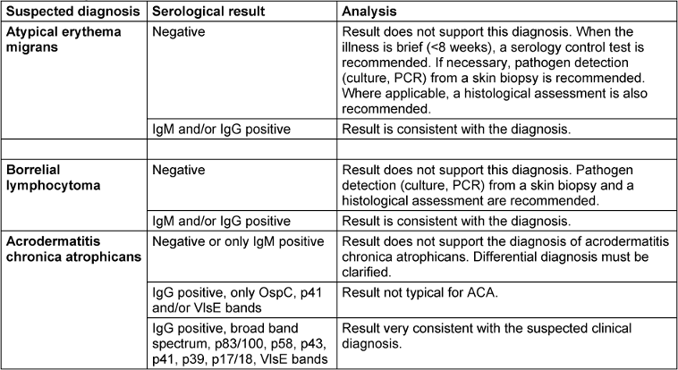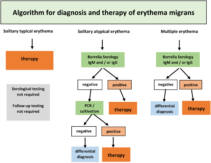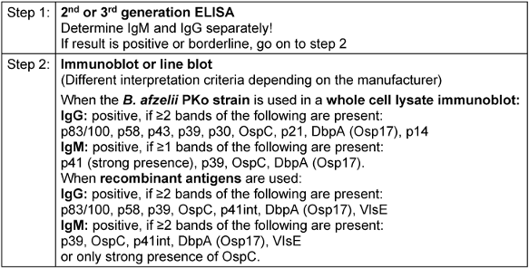 - Recommendations for stage-appropriate laboratory testing: serological detection of IgM and IgG Borrelia antibodies using the 2-step ELISA/immunoblot process; prudent use of procedures for molecular and culture-based diagnostic testing