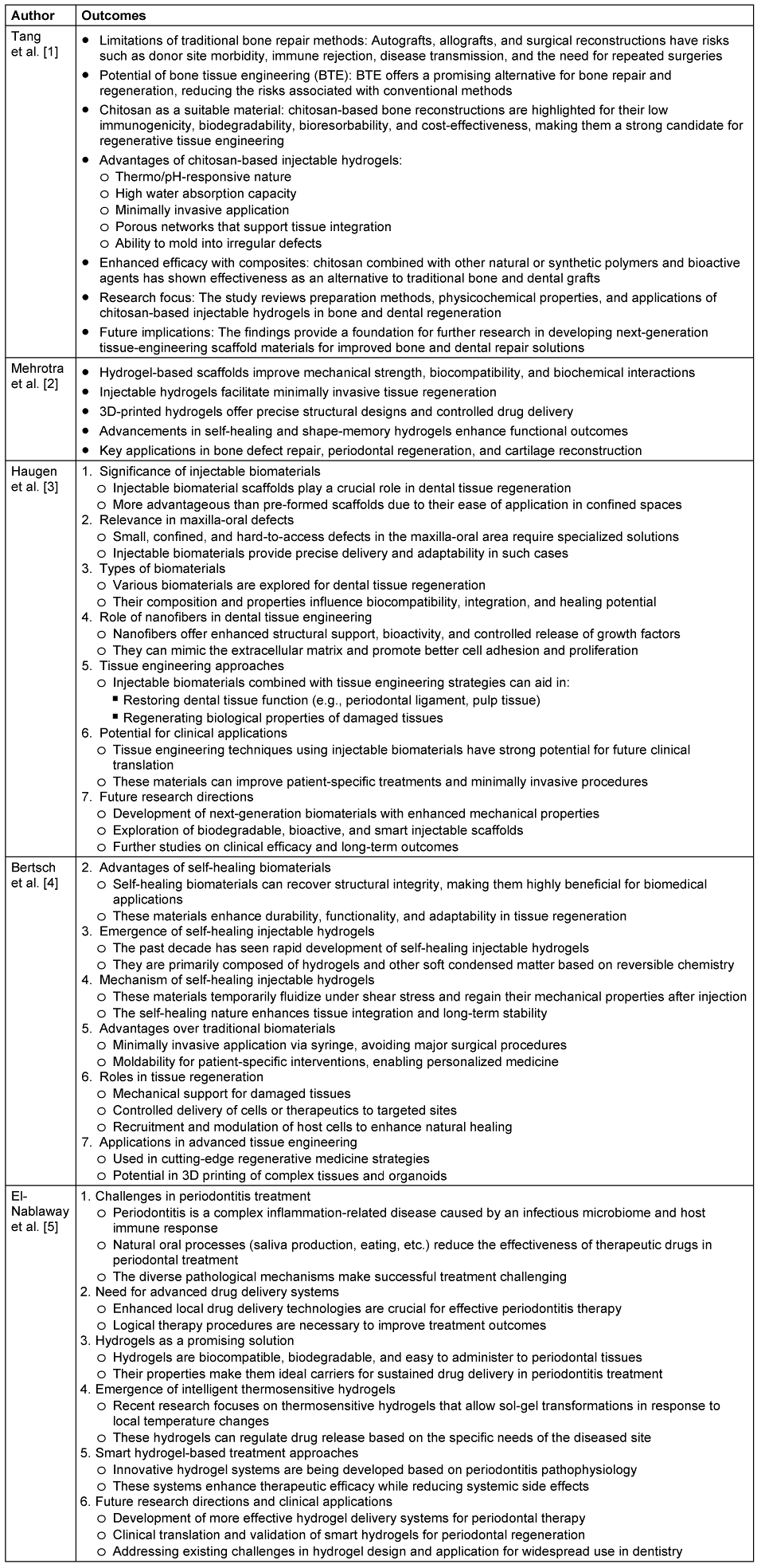 The reviewed studies collectively highlight the significant advancements in injectable hydrogels for bone and dental tissue regeneration. While chitosan-based and self-healing hydrogels have demonstrated promising biocompatibility and bioactivity, 3D-printed hydrogels have enabled precise tissue engineering with controlled drug release. Furthermore, the integration of nanofibers and thermosensitive properties has enhanced hydrogel adaptability for specific dental applications. However, challenges remain in terms of optimizing mechanical properties, ensuring long-term stability, and translating these innovations into clinical practice. Future research should focus on the development of multifunctional biomaterials that integrate self-healing, smart drug delivery, and patient-specific customization to advance the field of regenerative medicine and tissue engineering.