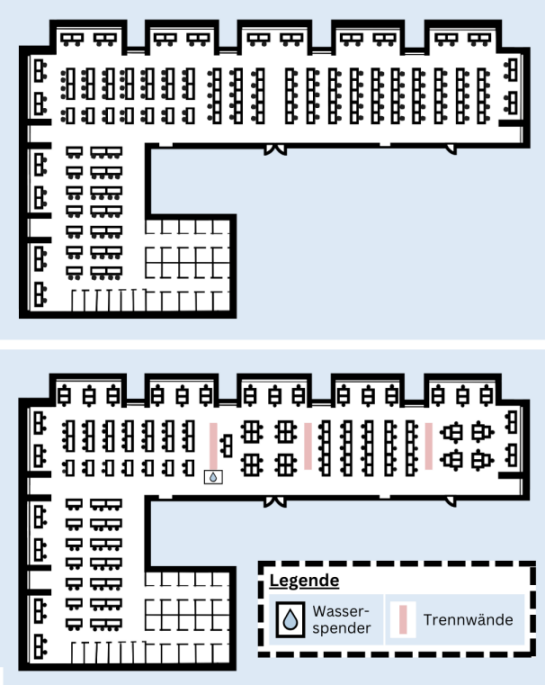 Kritikpunkt, der vor allem im Fokusgruppeninterview hervorgehoben wurde, ist, dass der obere Lesesaal zu groß, offen und ungemütlich ist. Daher suchen einige Personen lieber den lauteren unteren Lesesaal auf, wünschen sich aber auch in diesem Bereich die Ruhe, die zum Lernen erforderlich ist. Aus diesem Grund soll mit einer Separierung des oberen Lesesaals eine gemütlichere Atmosphäre in der Ruhezone geschaffen werden. Abbildung 4 [Abb. 4] stellt dabei die aktuelle Aufteilung des oberen Lesesaals einer neuen Aufteilung gegenüber.