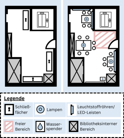 Für den unbekannten Raum bestanden vor dieser Erarbeitung keine detaillierten Vorstellungen zur Nutzung. Es bestand allerdings das Bedürfnis seitens der Bibliothek diesen zurzeit ungenutzten Raum den Nutzenden zur Verfügung zu stellen. Das Fokusgruppeninterview ergab zahlreiche Ideen, von denen viele im neuen Gestaltungsvorschlag umgesetzt wurden. Abbildung 5 [Abb. 5] stellt den aktuellen Aufbau des Raums dem neuen Design gegenüber.