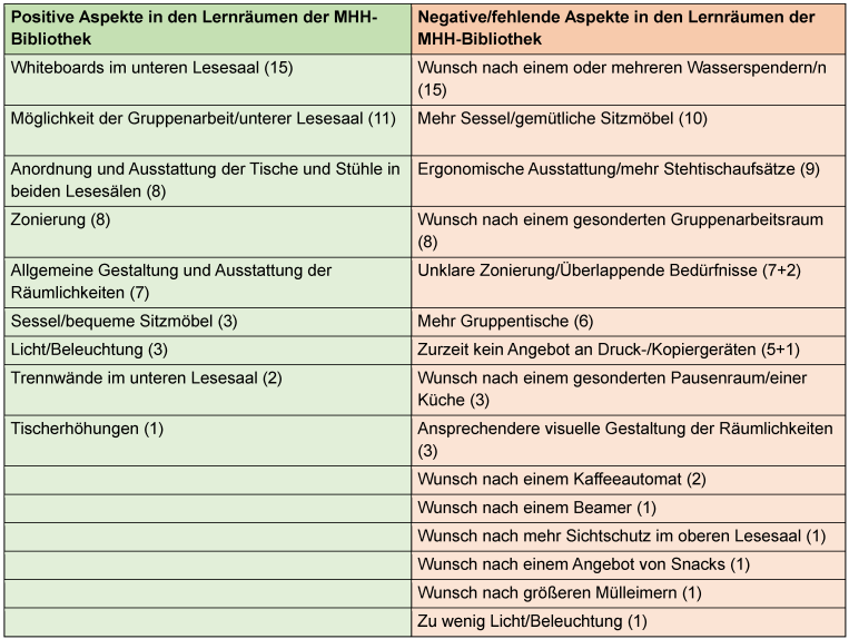 Tabelle 1: Positive, sowie negative/fehlende Aspekte in den Lernräumen der MHH-Bibliothek (Ergebniszusammenfassung der durchgeführten schriftlichen Befragung)