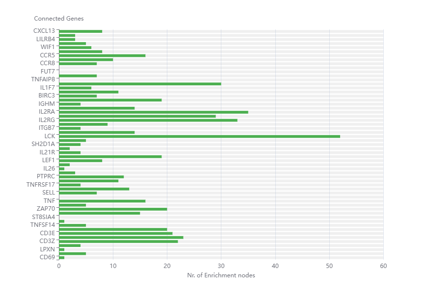 Further, a bar plot visualizes the input genes and their count of enriched pathways as seen in Figure 4 [Fig. 4] and Attachment 5 [Att. 5]. It demonstrates that some genes do not appear in any of the enriched pathways. In contrast, the gene LCK appears in 37 and in the modified Fisher’s exact test in 52 different enriched pathways.