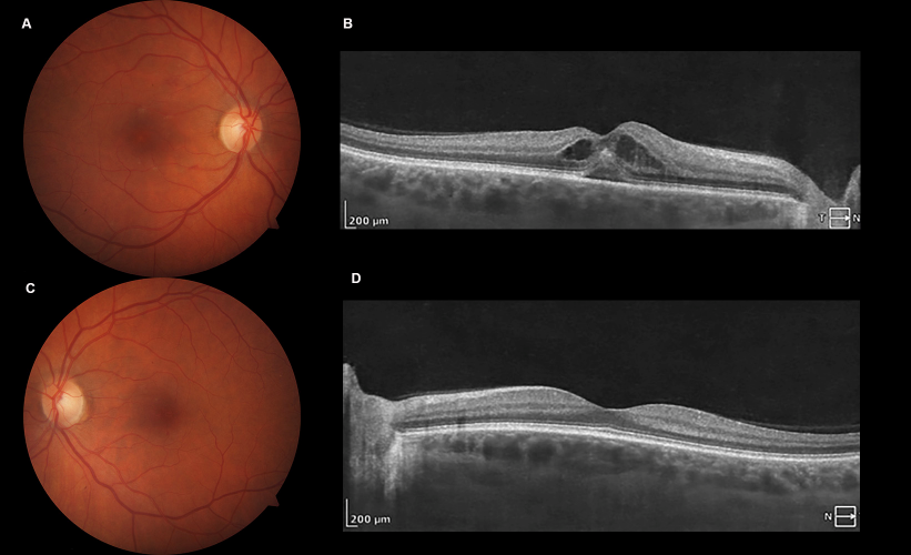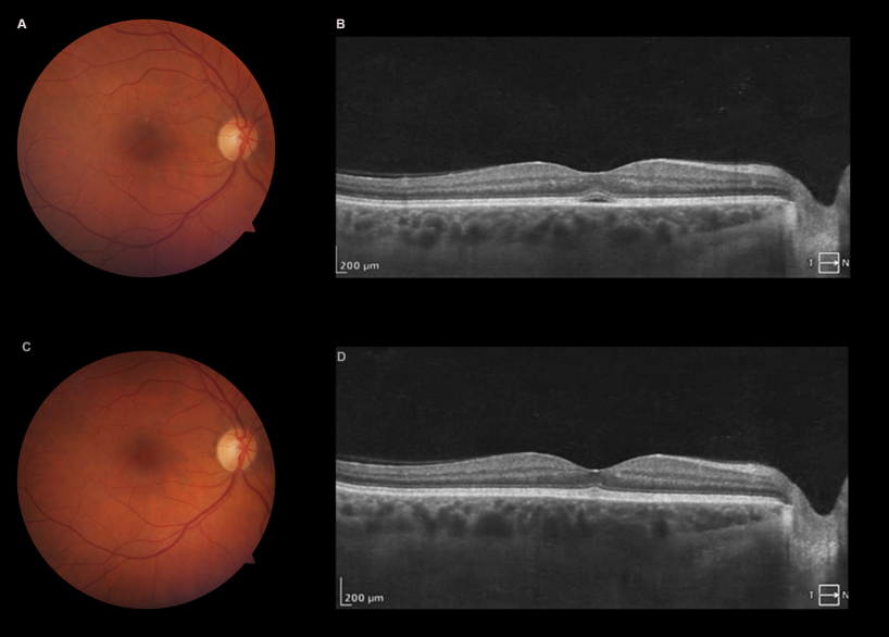 Figure 2: Three days after initial visit, fundoscopy (A) showing improvement, and OCT revealing residual SRF (B). 10 days after first evaluation, fundoscopy (C), and OCT (D) were normal.